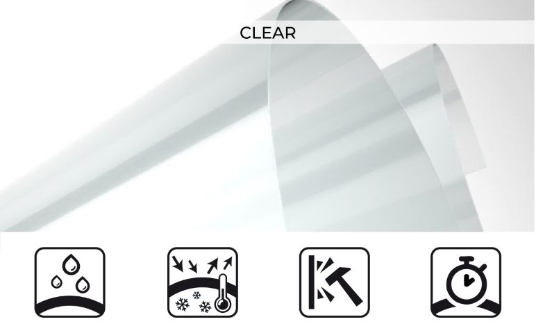 Transparent PVC film. Extremely light, weather and UV resistant. Clear is also a great thermal insulator and free of harmful chemicals.