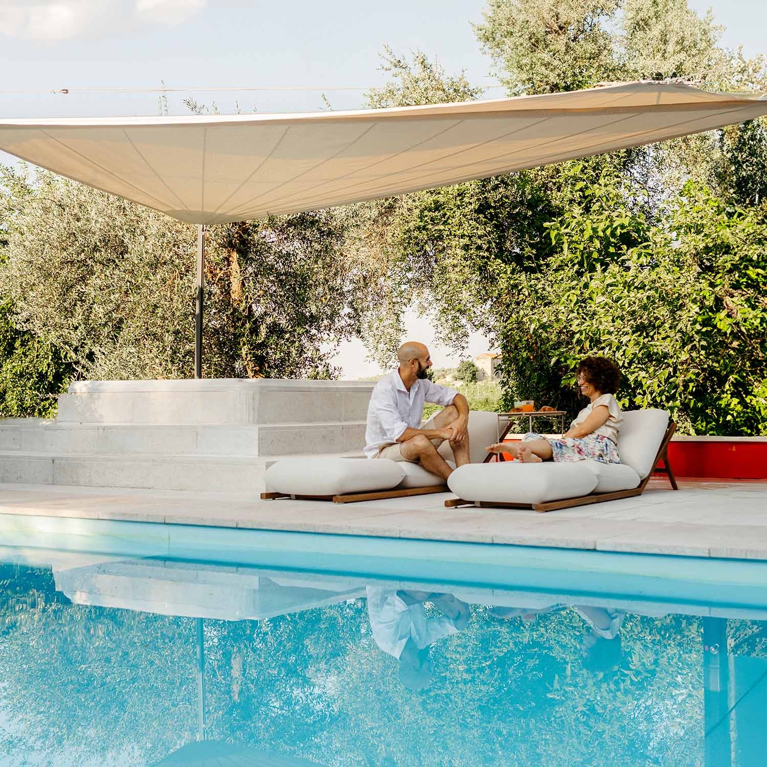 In addition to its versatility, Tuga continues to impress with its combination of Italian design and fine materials. FLEGT-certified Indonesian teak ensures sustainably sourced, while the polypropylene construction ensures strength and durability. But the real heart of Tuga are its cushions, handmade in Italy with the "Quick Dry" sponge, a polyurethane foam system that ensures rapid water drainage, ideal for outdoor use.