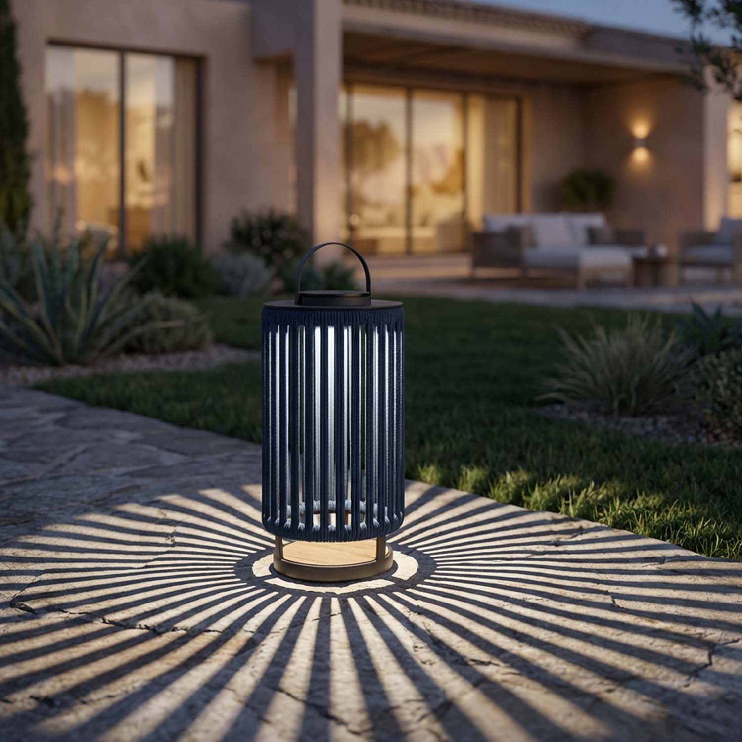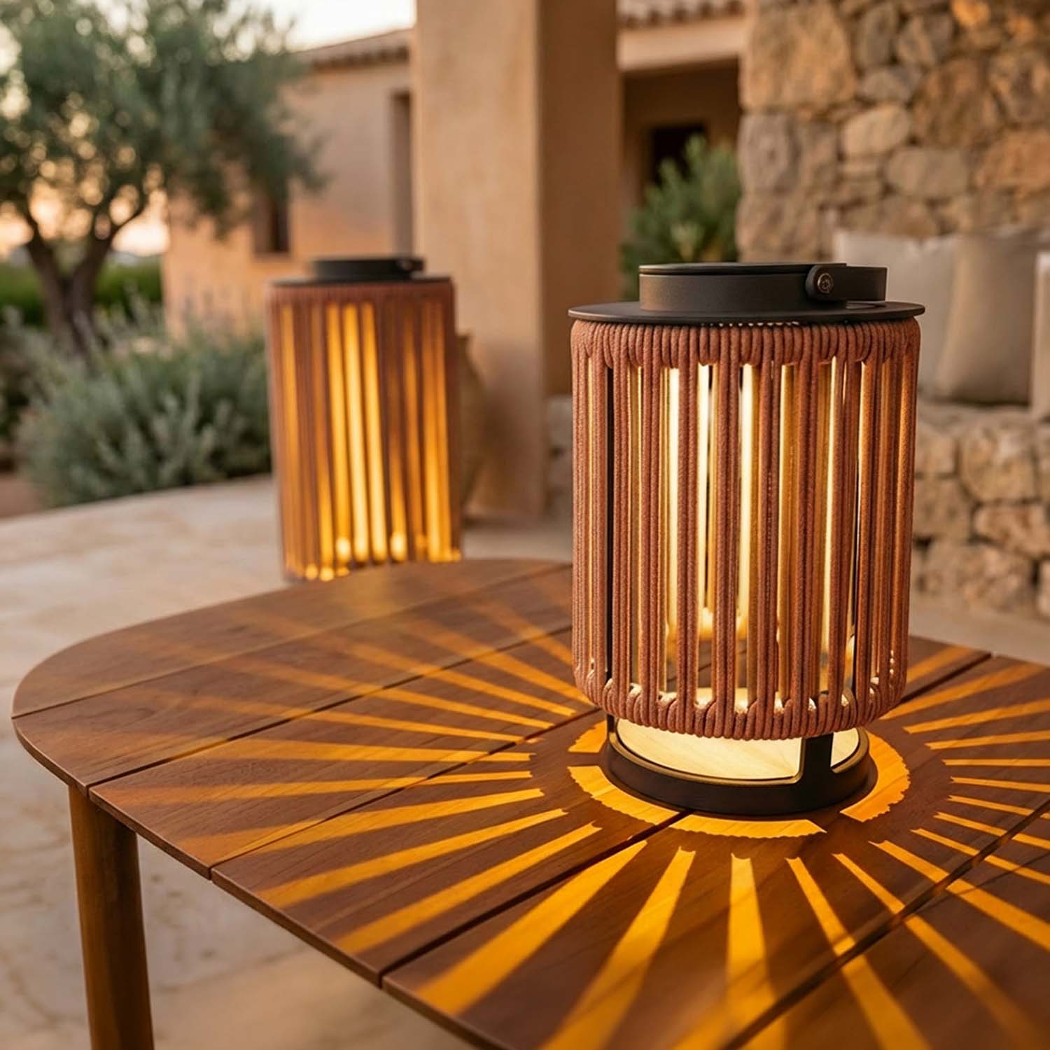 The nylon rope is woven according to a precise radial pattern. When the LED lights up, each ray of light filtering through the ropes draws a sunburst motif on the surrounding surfaces: the table, the wall, the terrace floor. It is not a random effect. It is geometry applied to lighting.