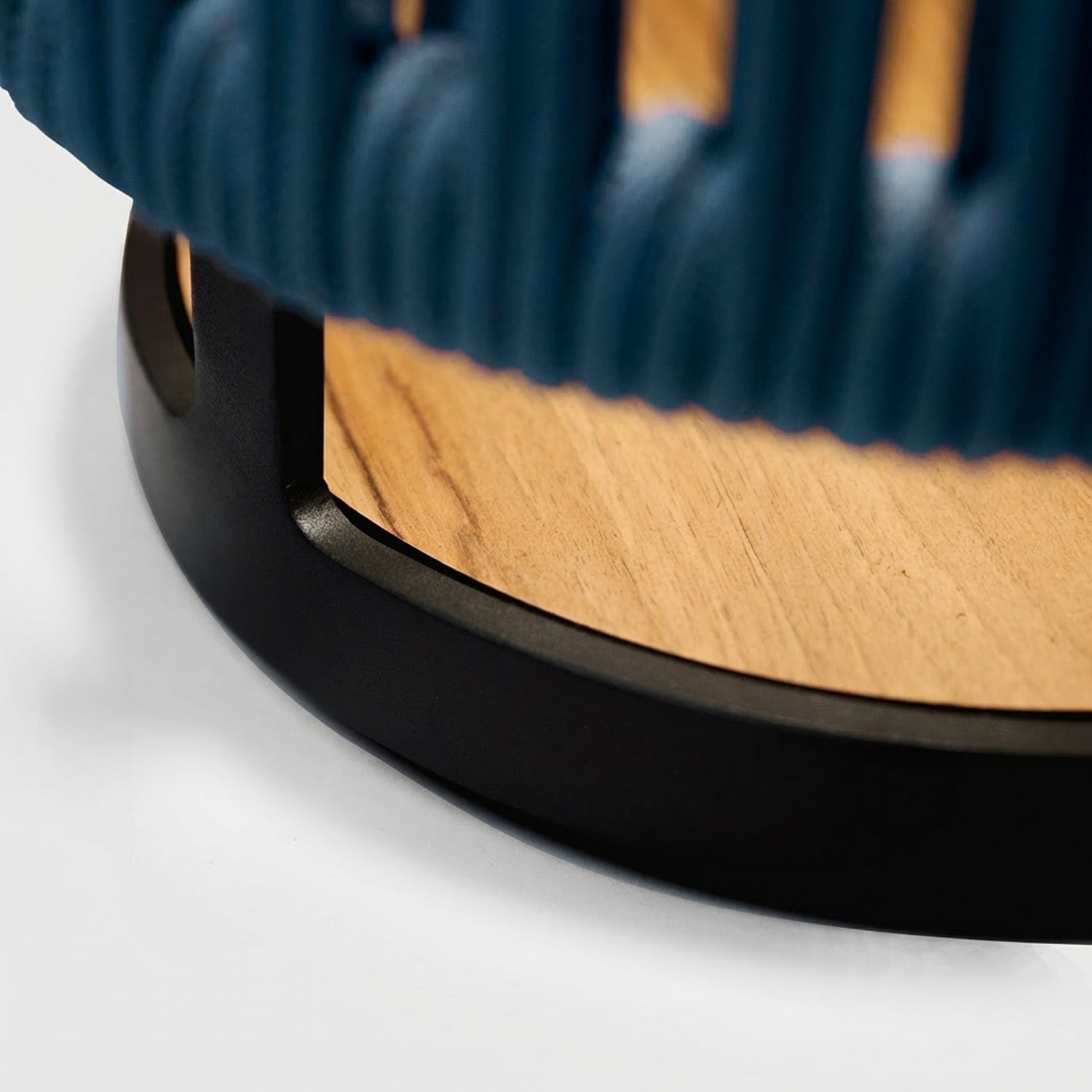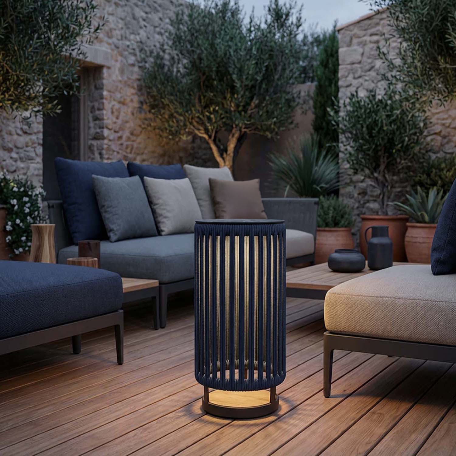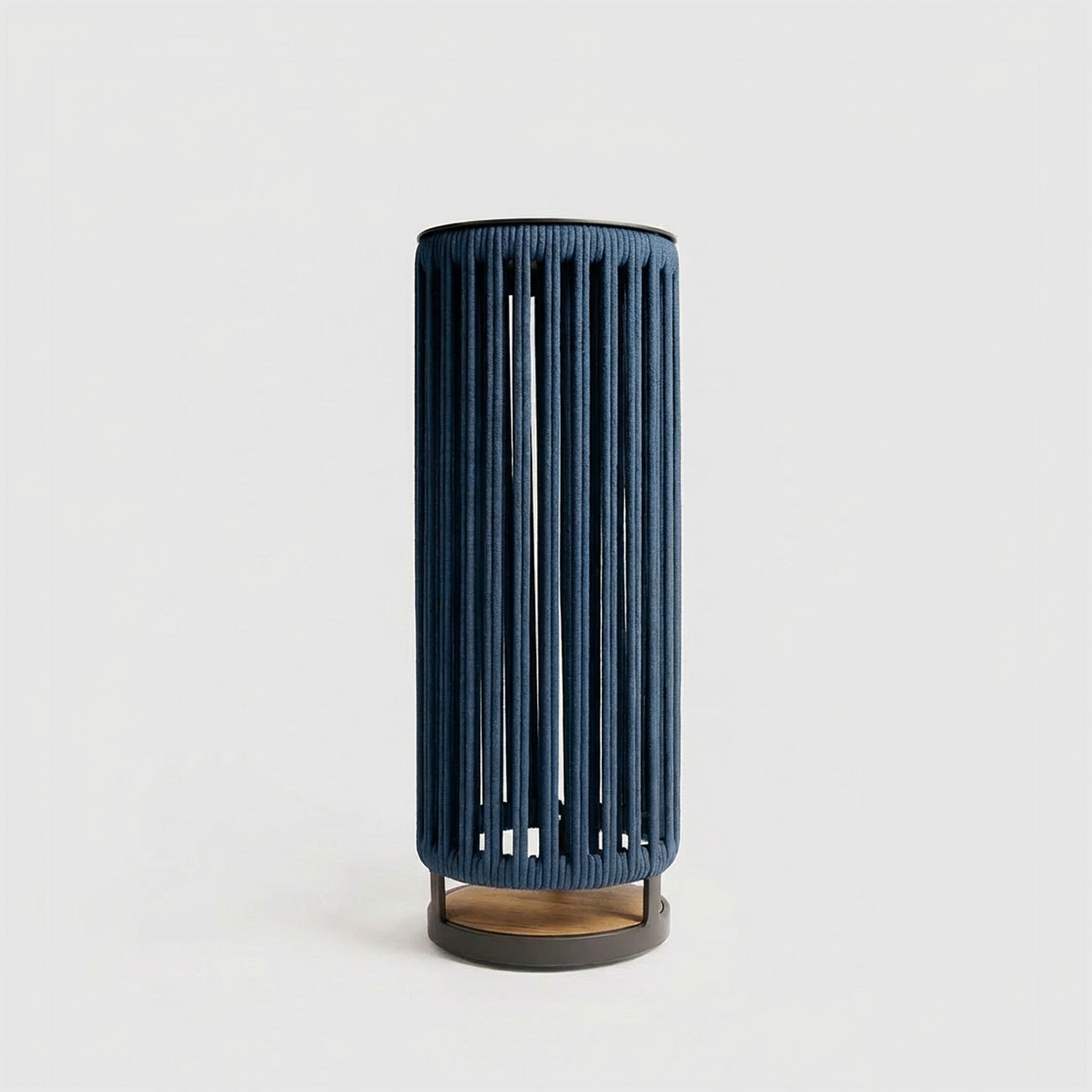 It has no handle: that is a deliberate design choice. The base is designed to stay firmly in place, night after night, on steps, low walls, and planters. When it turns on, the rope filters the light and casts linear, rhythmic shadow lines onto the surrounding surfaces.