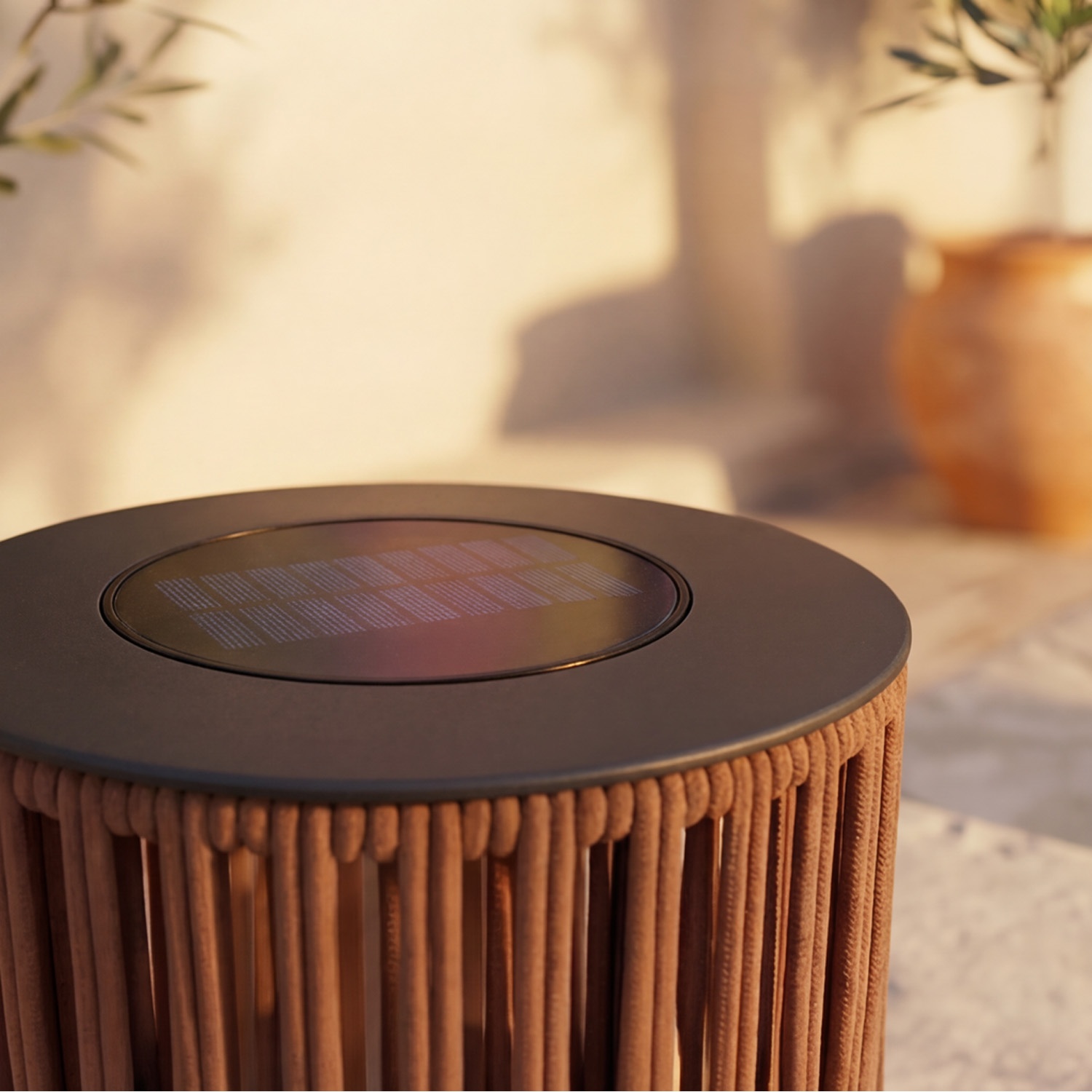 It has no handle: that is a deliberate design choice. The base is designed to stay firmly in place, night after night, on steps, low walls, and planters. When it turns on, the rope filters the light and casts linear, rhythmic shadow lines onto the surrounding surfaces.
