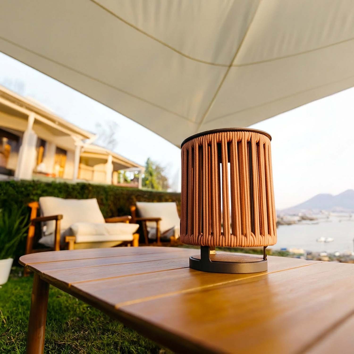 Filara is an outdoor solar table lamp with vertically woven nylon rope.