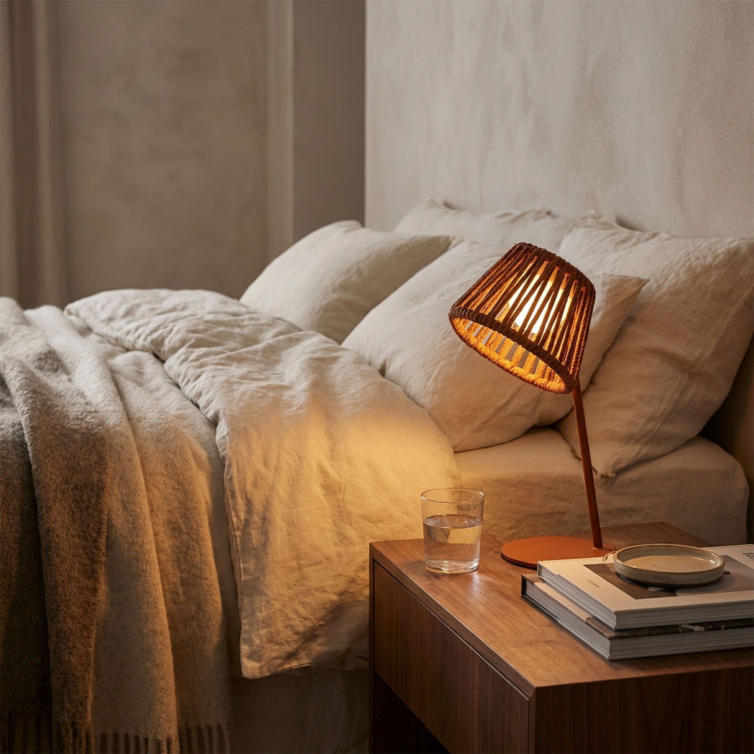Warm light for reading. Recharges on your nightstand throughout the day.