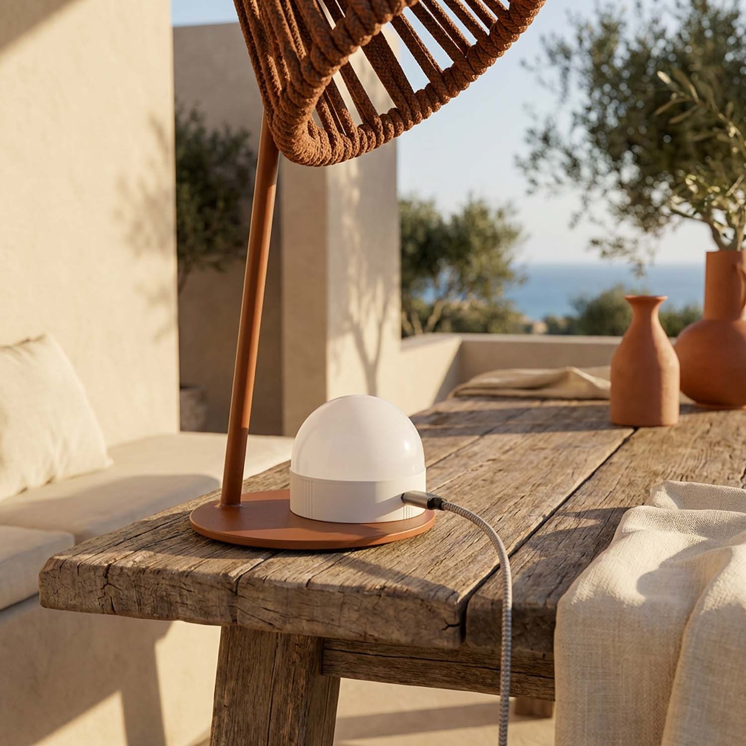 Mini Ropelle is a cordless rechargeable table lamp featuring hand-woven olefin polypropylene rope, a material specifically designed for outdoor use that won’t fade and stands up to rain, sun, and salt air. The magnetic Mag bulb detaches in one simple motion and recharges via USB-C separately, so you can keep the lamp right where it is. Perfect for gardens, patios, living rooms, and desks: ambient lighting without the hassle of cords. Designed and crafted in Italy, it brings a touch of Italian style and functionality to American outdoor spaces.