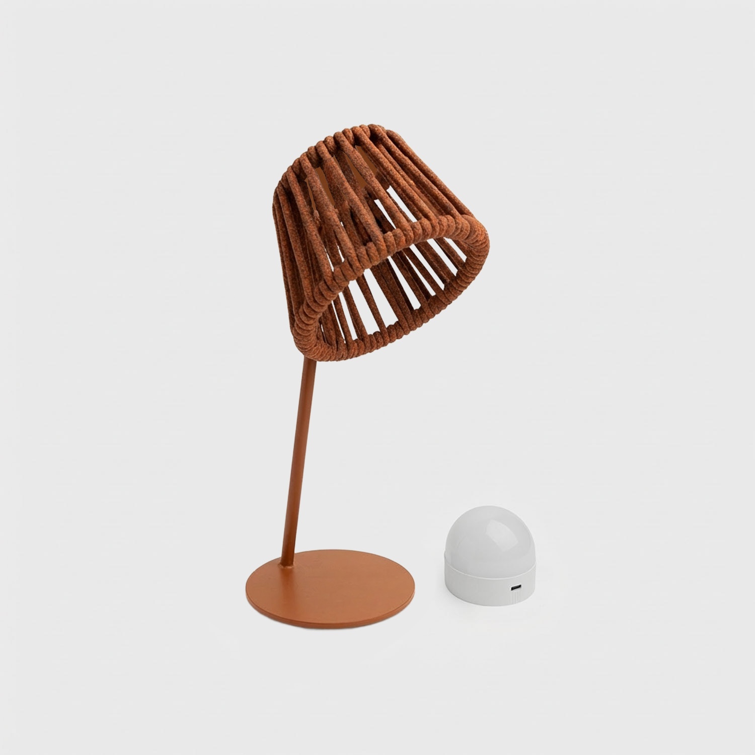 The lamp comes complete with a painted iron frame, olefin rope covering, and a pre-installed Mag magnetic bulb. Ready to use after the first charge.