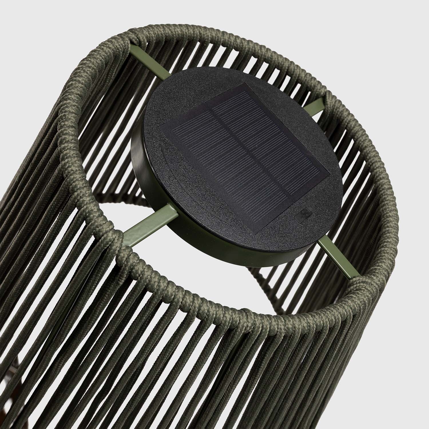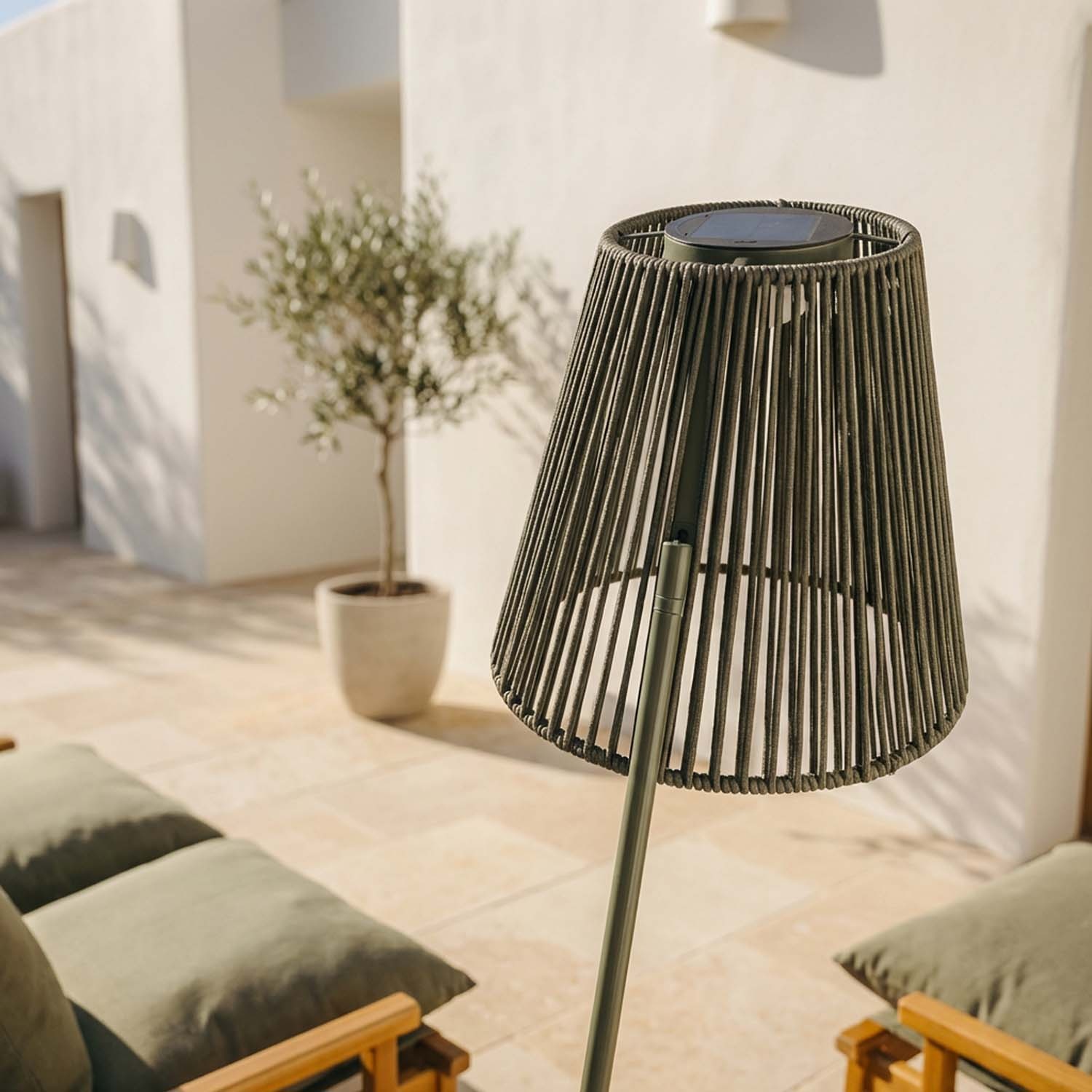 Ropelle is an outdoor solar lamp 63" tall, featuring a braided olefin polypropylene rope – a material especially designed for outdoor use – that creates a unique play of light and shadow in the evening. The solar panel charges it during the day, while the dusk sensor automatically switches it on at sunset and off at sunrise. Perfect for backyards, patios and any outdoor space where you want to create atmosphere without an electrician or energy bills.