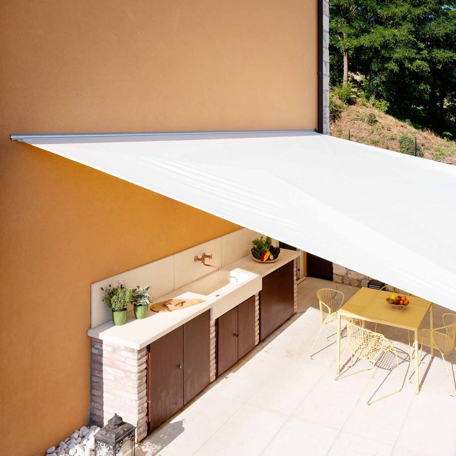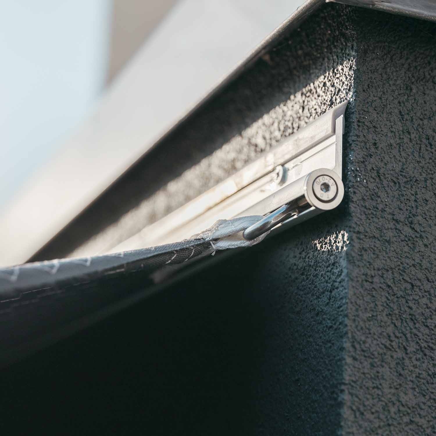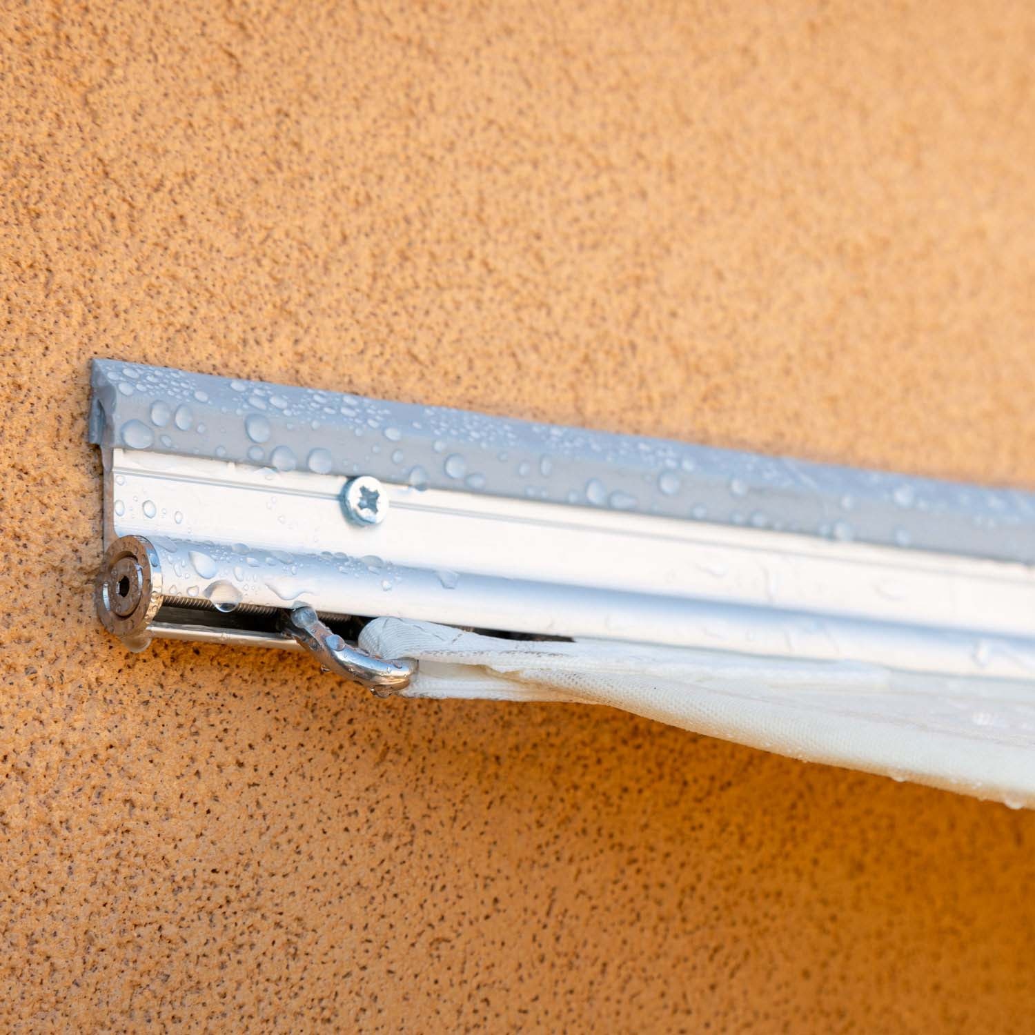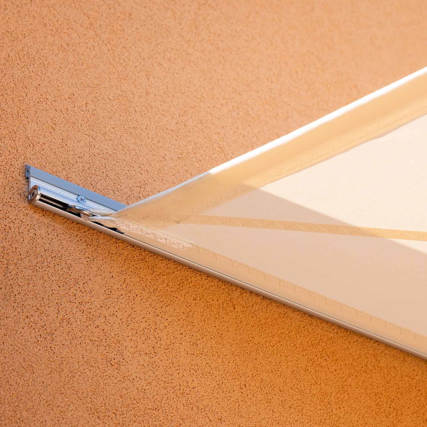 The aluminum profile attached to the entire side of the sail does not allow rainwater to pass between the sail and the wall.