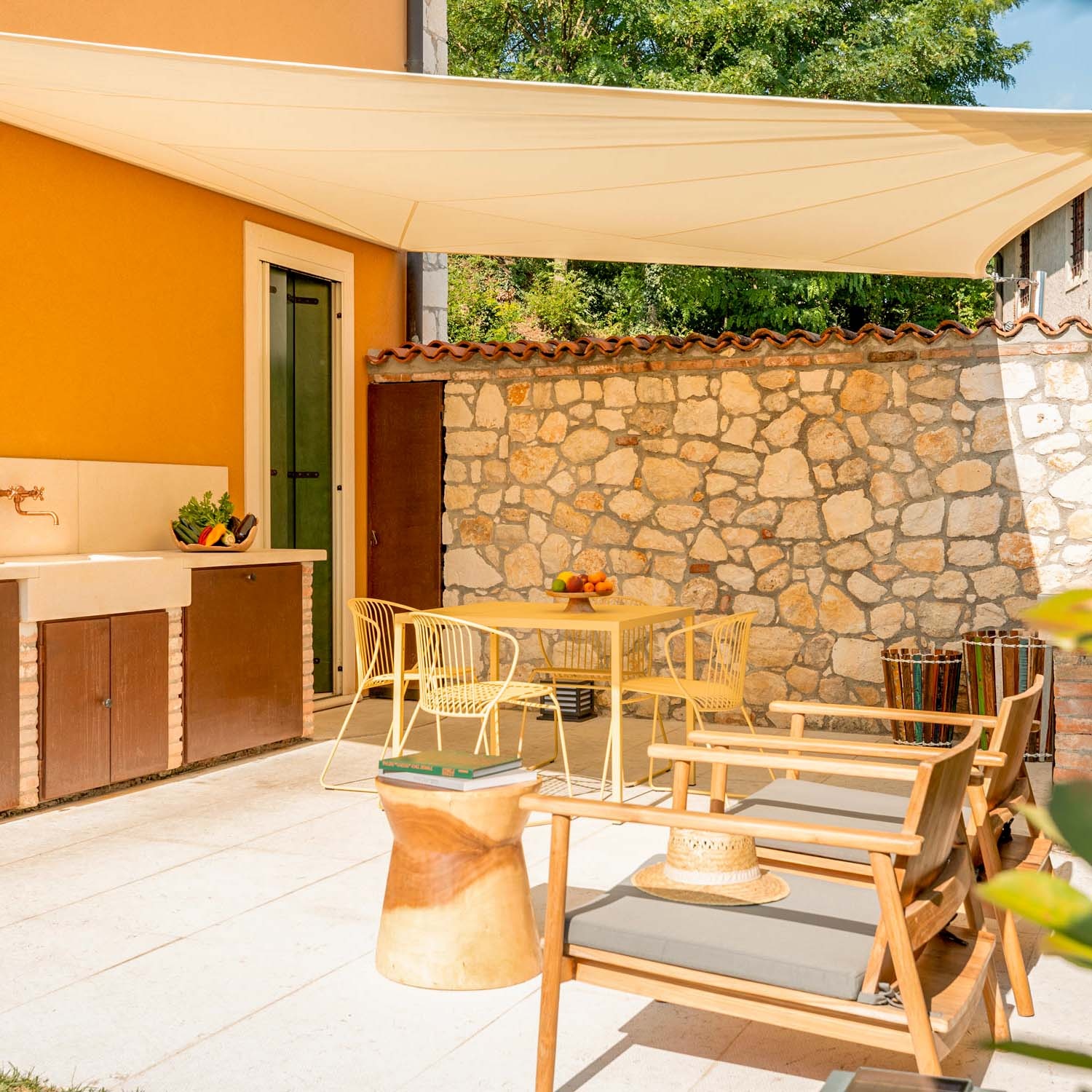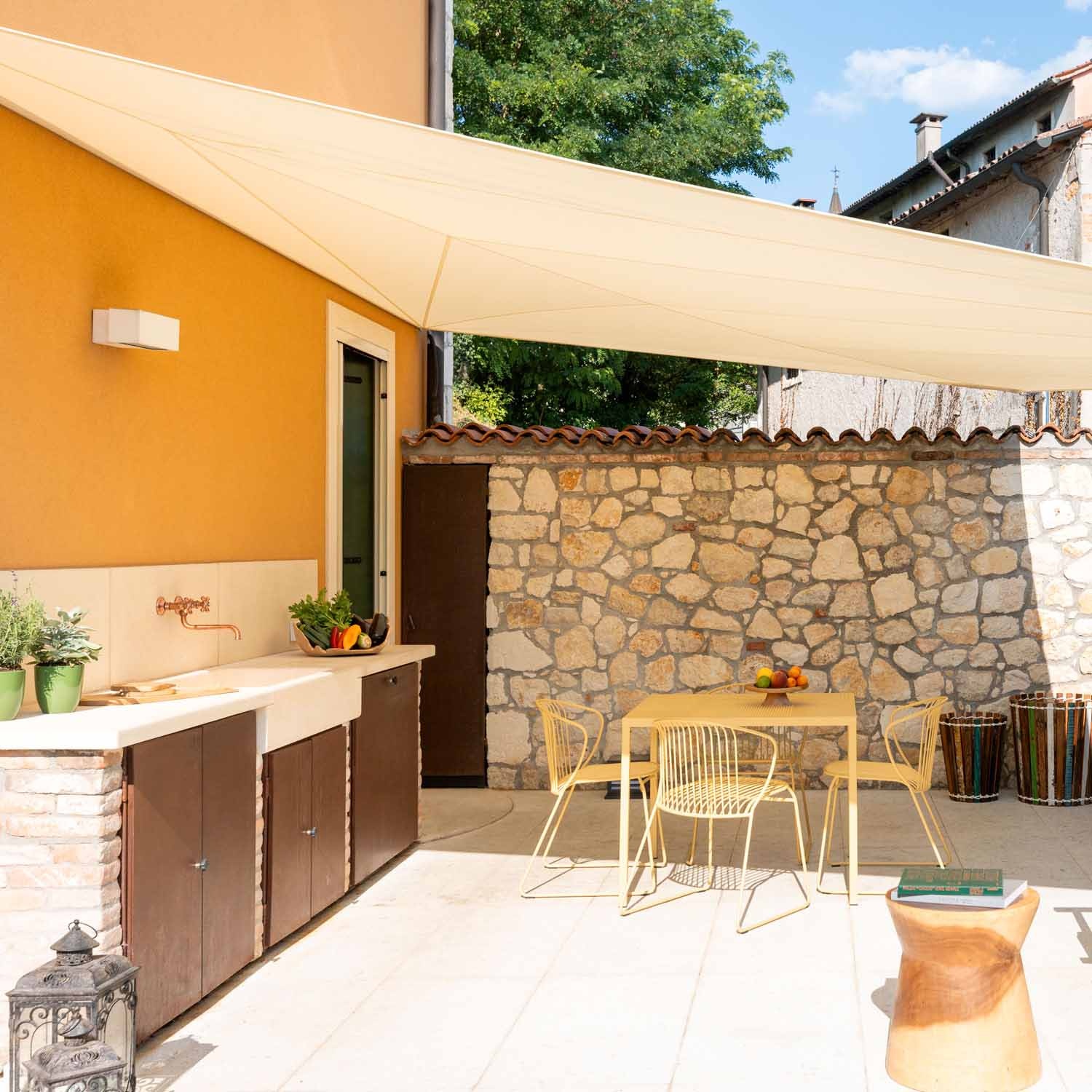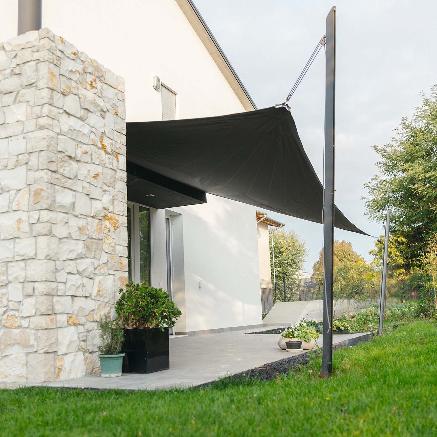 Thus anchoring an entire side of the sail to an exterior wall provides complete protection from dripping and maximum comfort even in heavy rain.