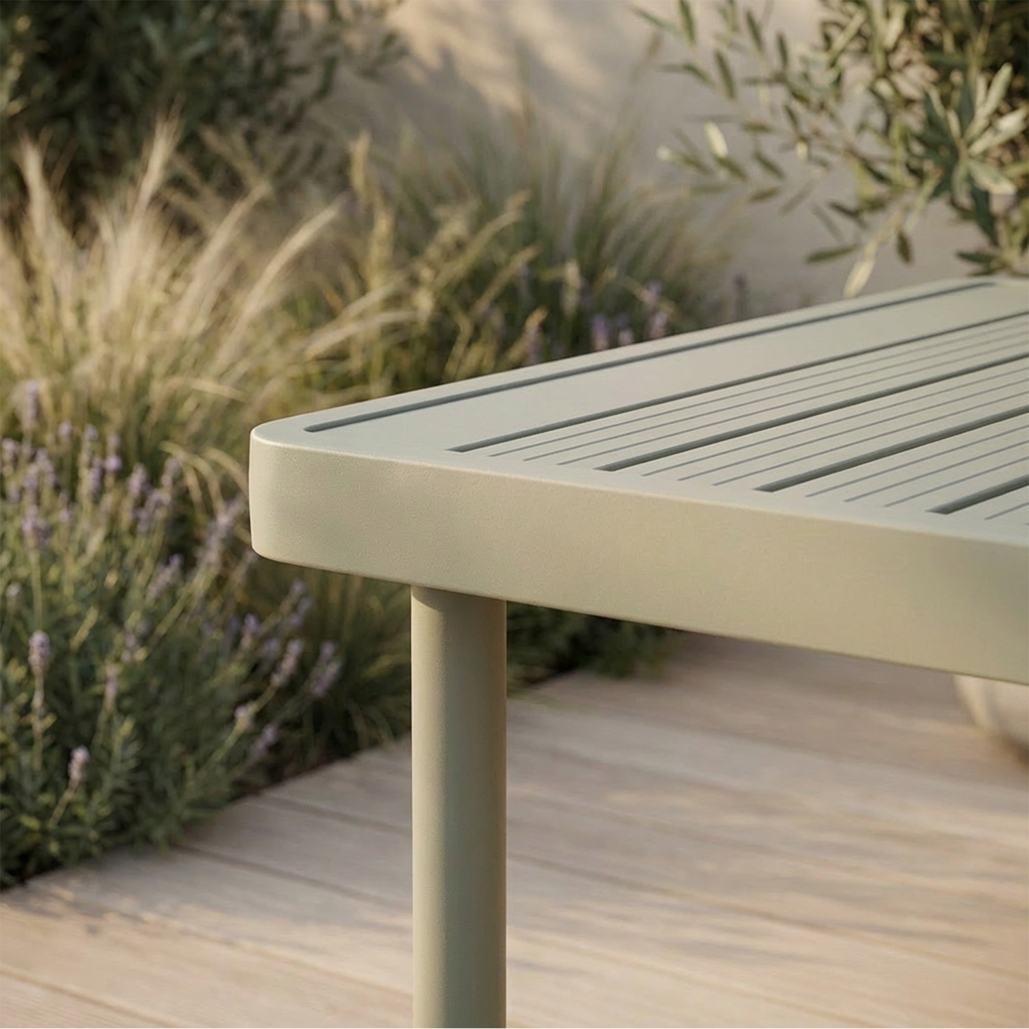 The powder coating reduces heat absorption. The frame may warm up in direct summer sunlight, but all contact points with the body are always protected by cushions. In the shade or under a Maanta shade sail, the temperature remains comfortable.