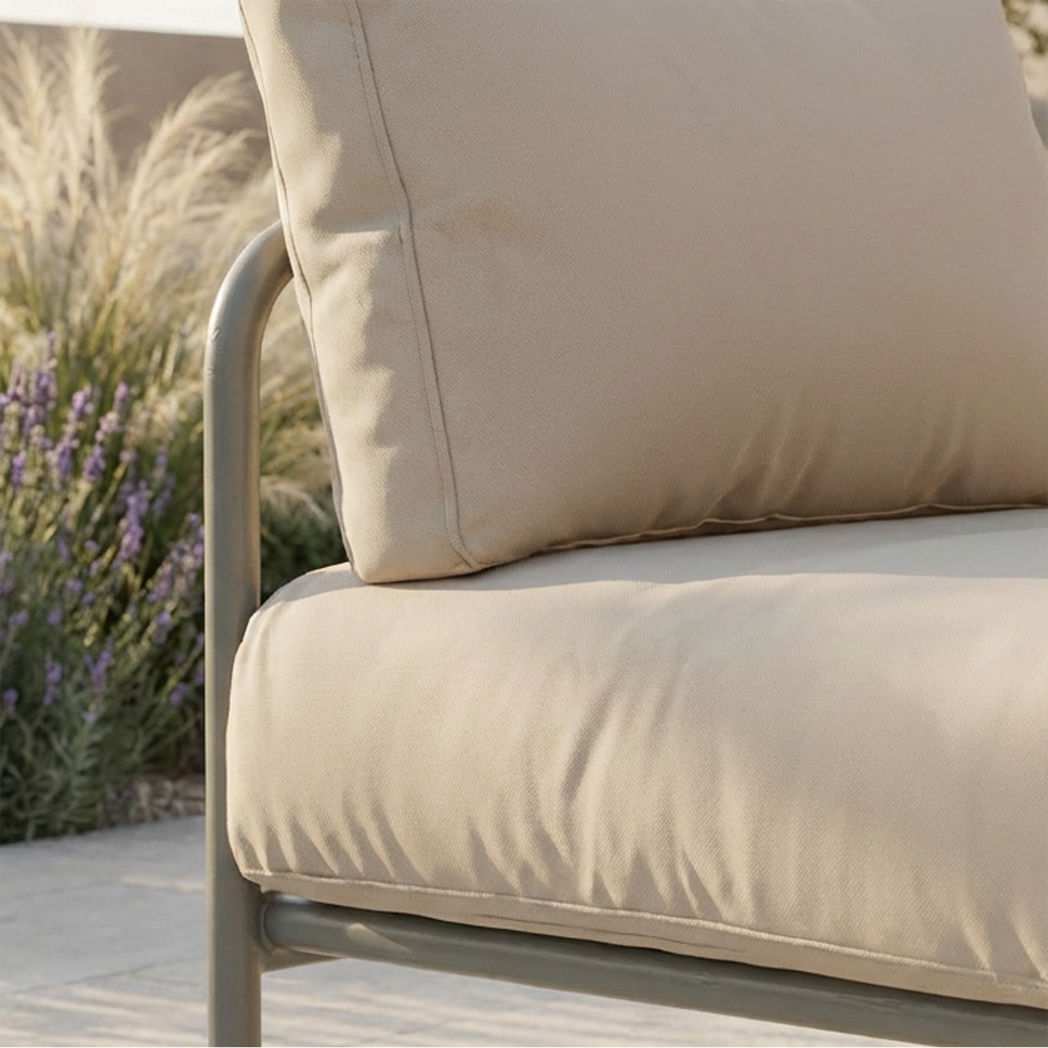 The cushions are the heart of the design: 16 cm thick, rounded profile, upholstered in Olefin fabric that repels water, stains and UV rays without becoming stiff. The high-density padding maintains its shape and support season after season: it holds, supports, embraces.