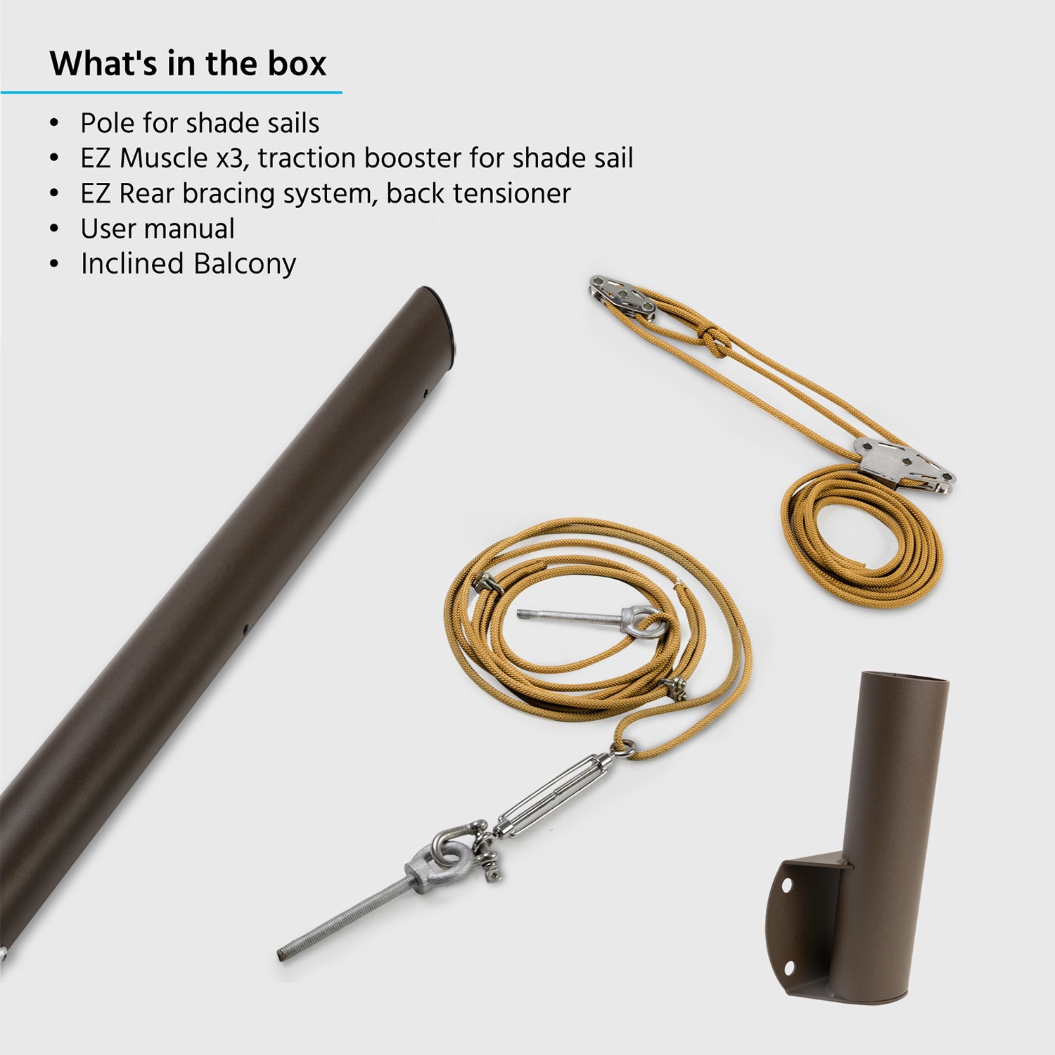Get everything you need with our full kit of accessories, in the wall collar version you will find two steel plates, in the balcony version you will find the inclined plate, all include kits for tensioning the sail and any rear bracing system, hardware and screws.