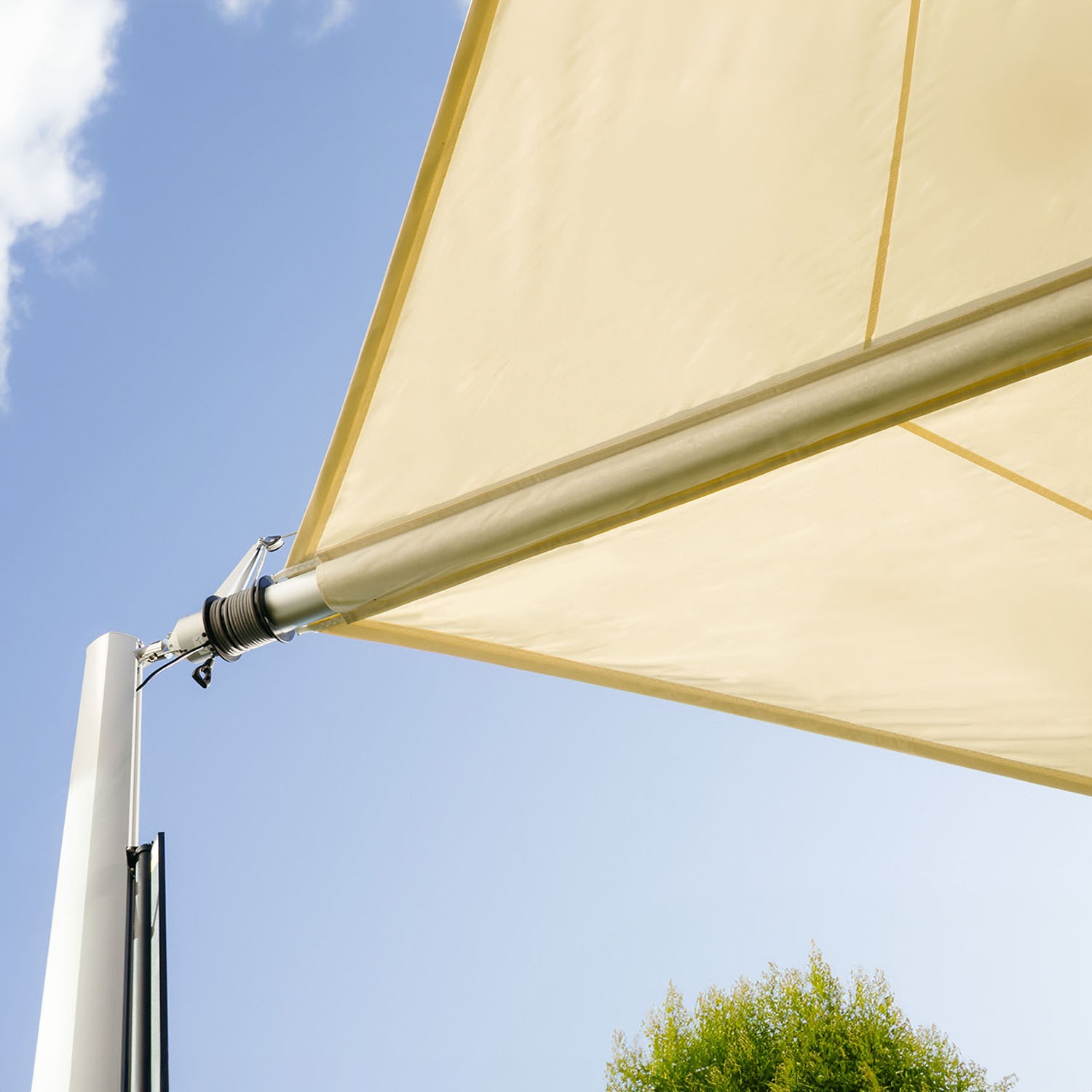 Included tensioning system components Spring unit, rope winding pulley, corner pulleys on the shade sail, tensioning rope, cantilever bracket