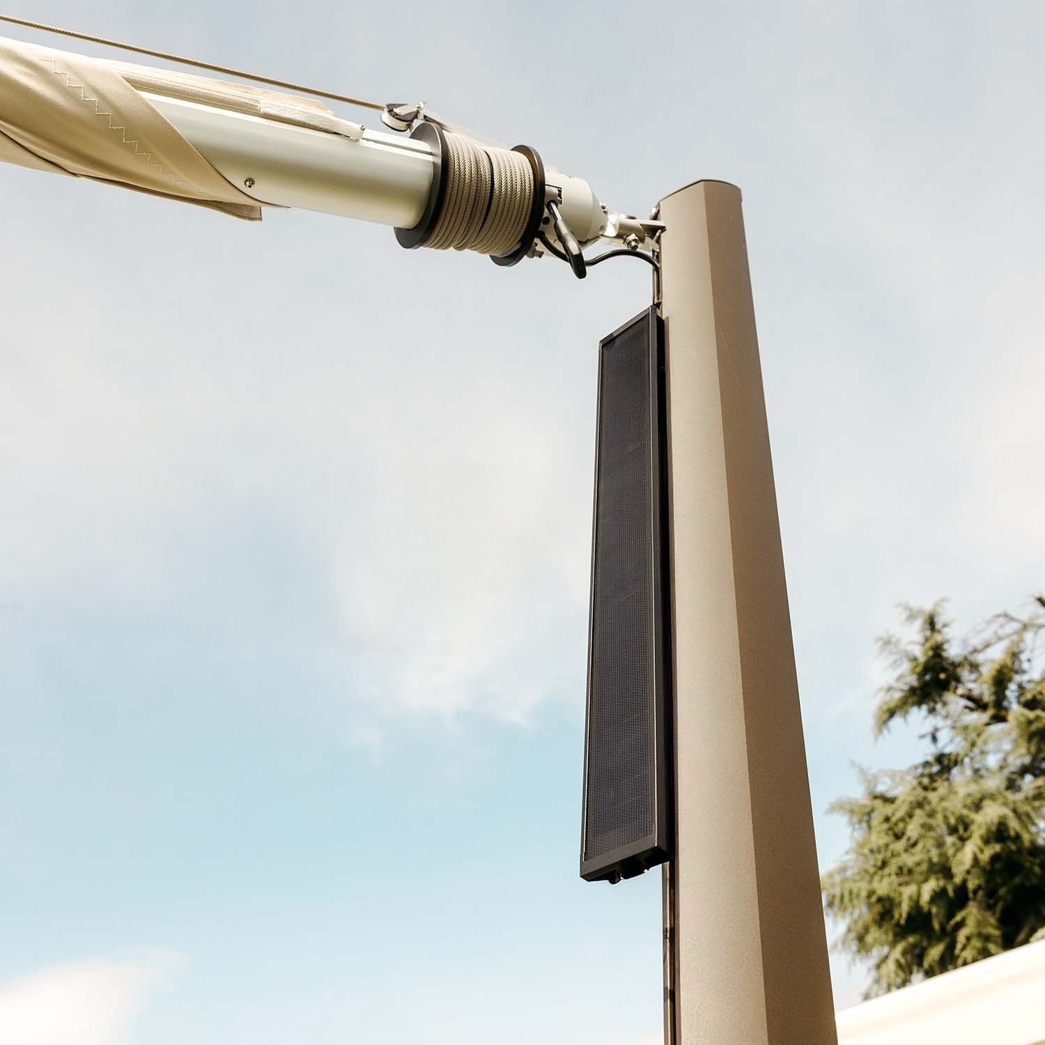 The motorized retractable shade sail Zefira needs its solar panel to be installed in direct sunlight to effectively recharge the built-in battery during the day. Once charged, the battery powers multiple open/close cycles – so you can use Zefira even after sunset or on cloudy days.