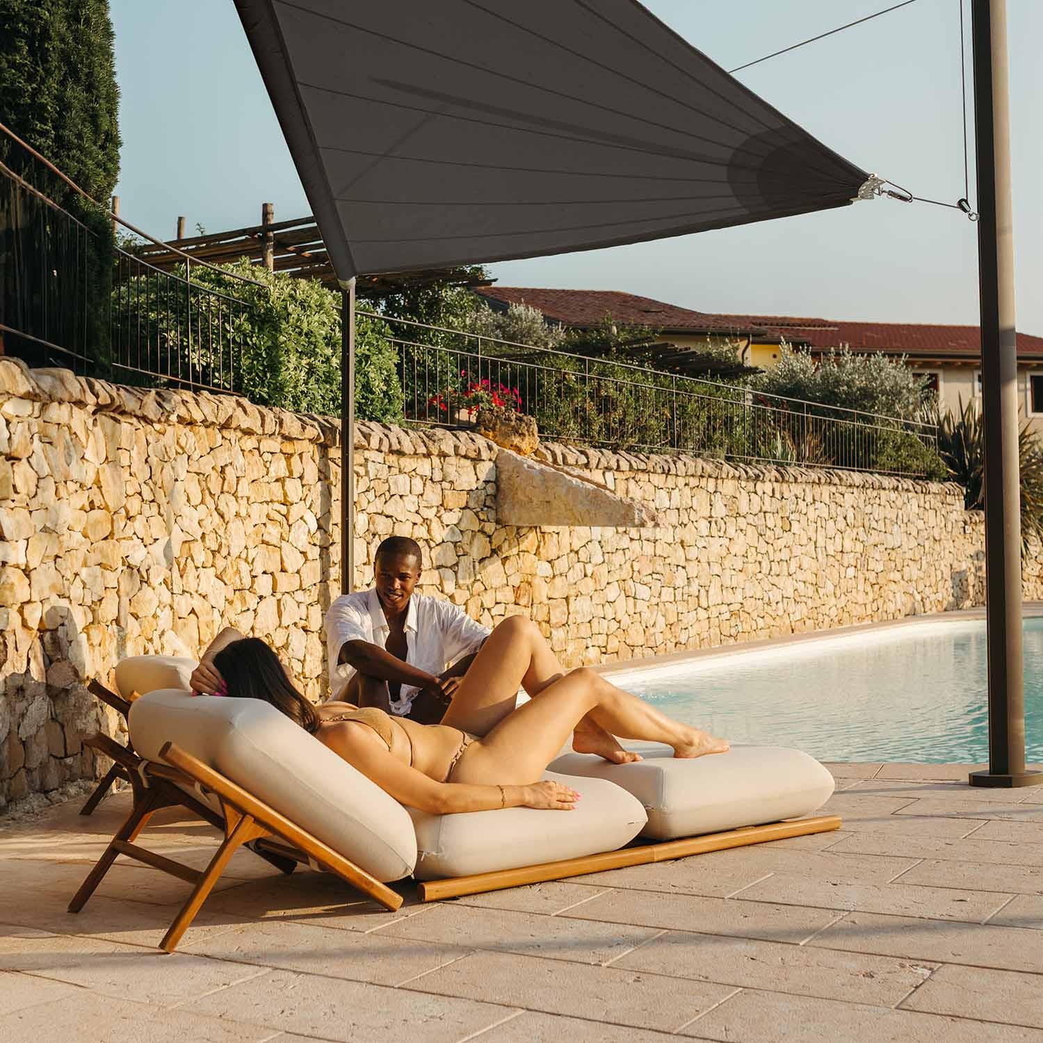 The motorized retractable shade sail Zefira needs its solar panel to be installed in direct sunlight to effectively recharge the built-in battery during the day. Once charged, the battery powers multiple open/close cycles – so you can use Zefira even after sunset or on cloudy days.