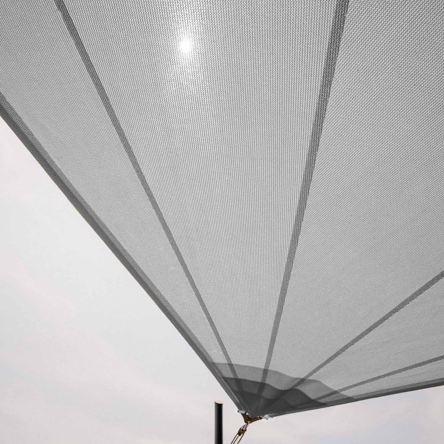 Solaria Breathable  is a radial-cut shade sail made from breathable Meshnet® HDPE 320 fabric that protects against intense heat and hail and shelters against UV rays and strong winds.